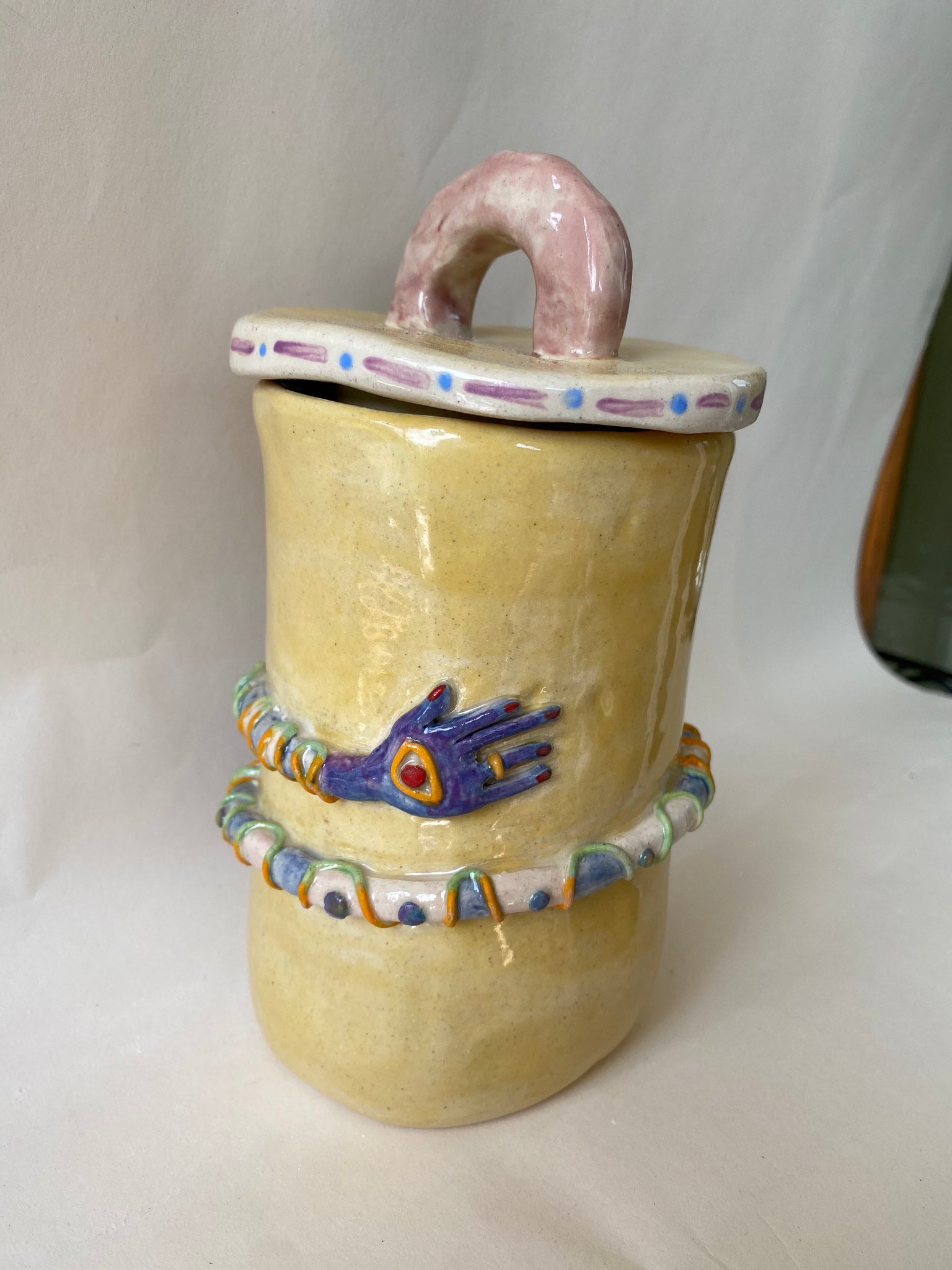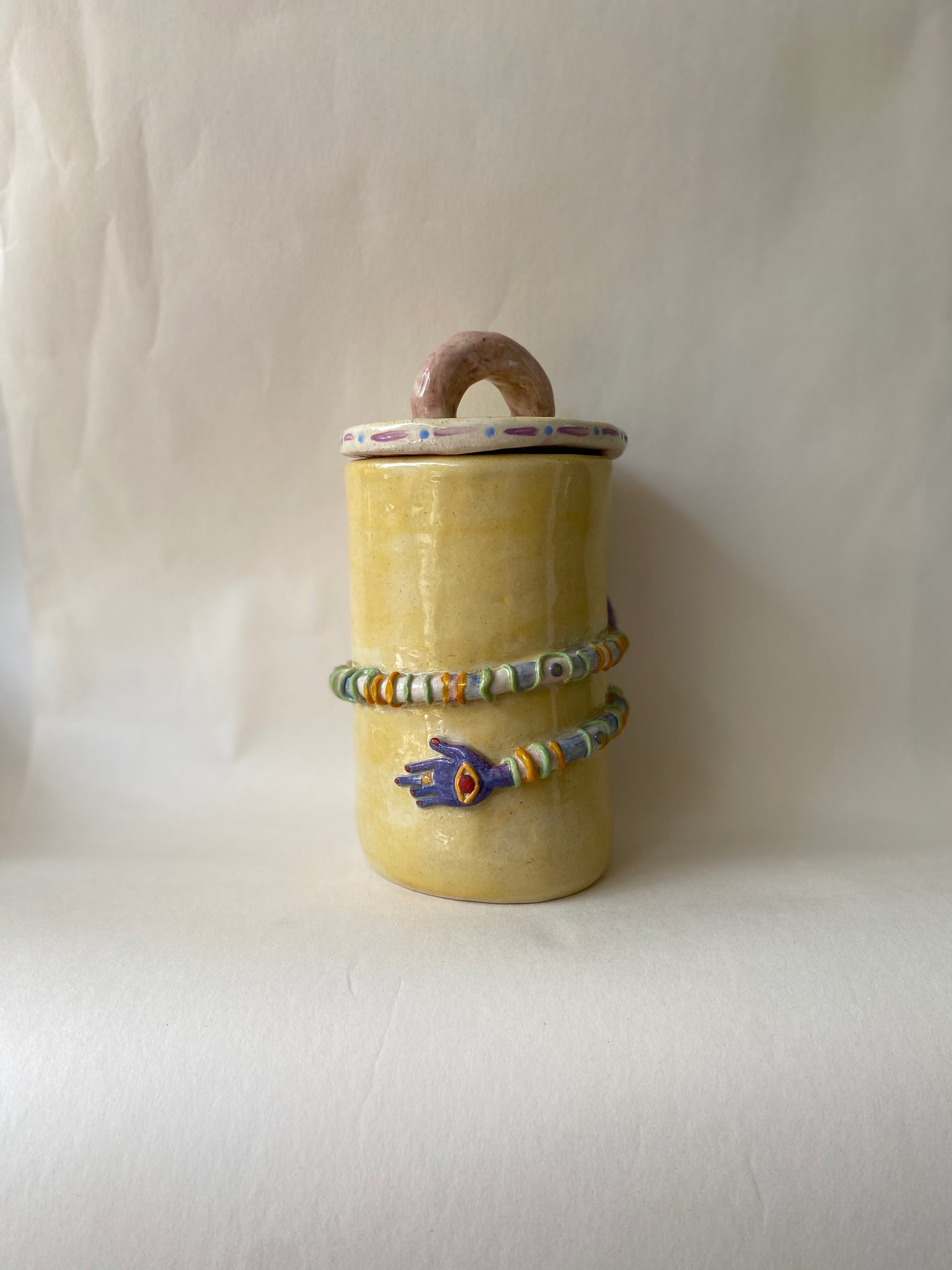 This Hug Jar is part of our most popular collection to date. Each Hug undergoes a multistep process and is a completely one-of-a-kind, original sculpture. Once the vessel is hand-built, the hug is sculpted and attached to the mug. The lid is sculpted to loosly fit the jar. Fine details are added, the piece is trimmed and then painted. Afterwhich the Hug Jar undergoes its first kiln firing, before being glazed and returned to the kiln for its final firing.