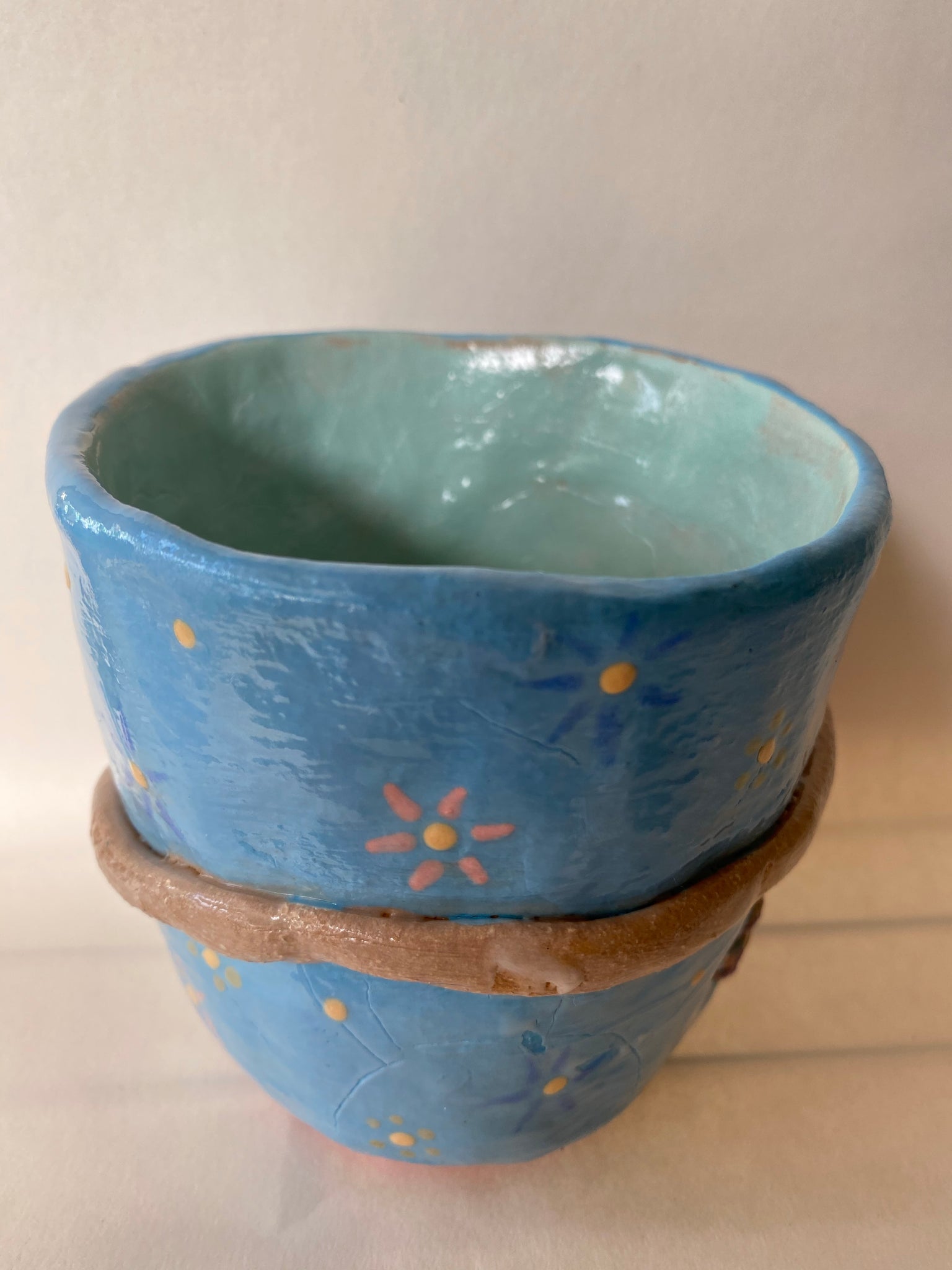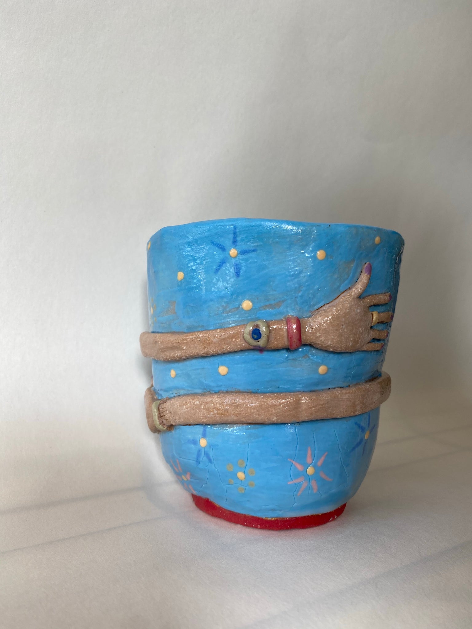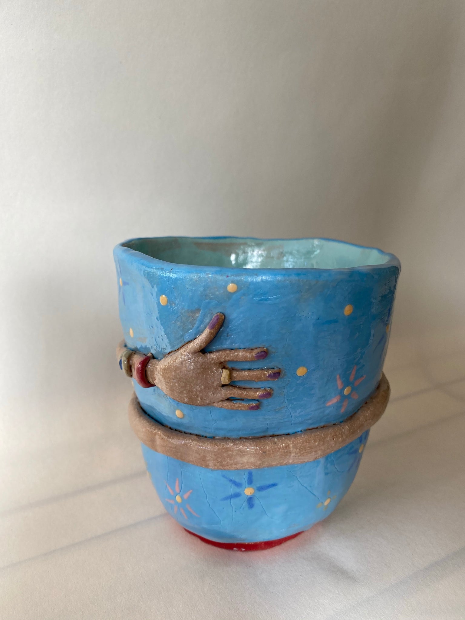 The Hug Mug is our most popular collection to date Each tumbler undergoes a multistep process and is a completely one-of-a-kind, original sculpture. The Hug Mug is wheel-thrown, and the hug is hand sculpted and attached to the mug. The mug is then trimmed, painted, and fired in the kin. It is then glazed and returned to the kiln for its second and final firing.