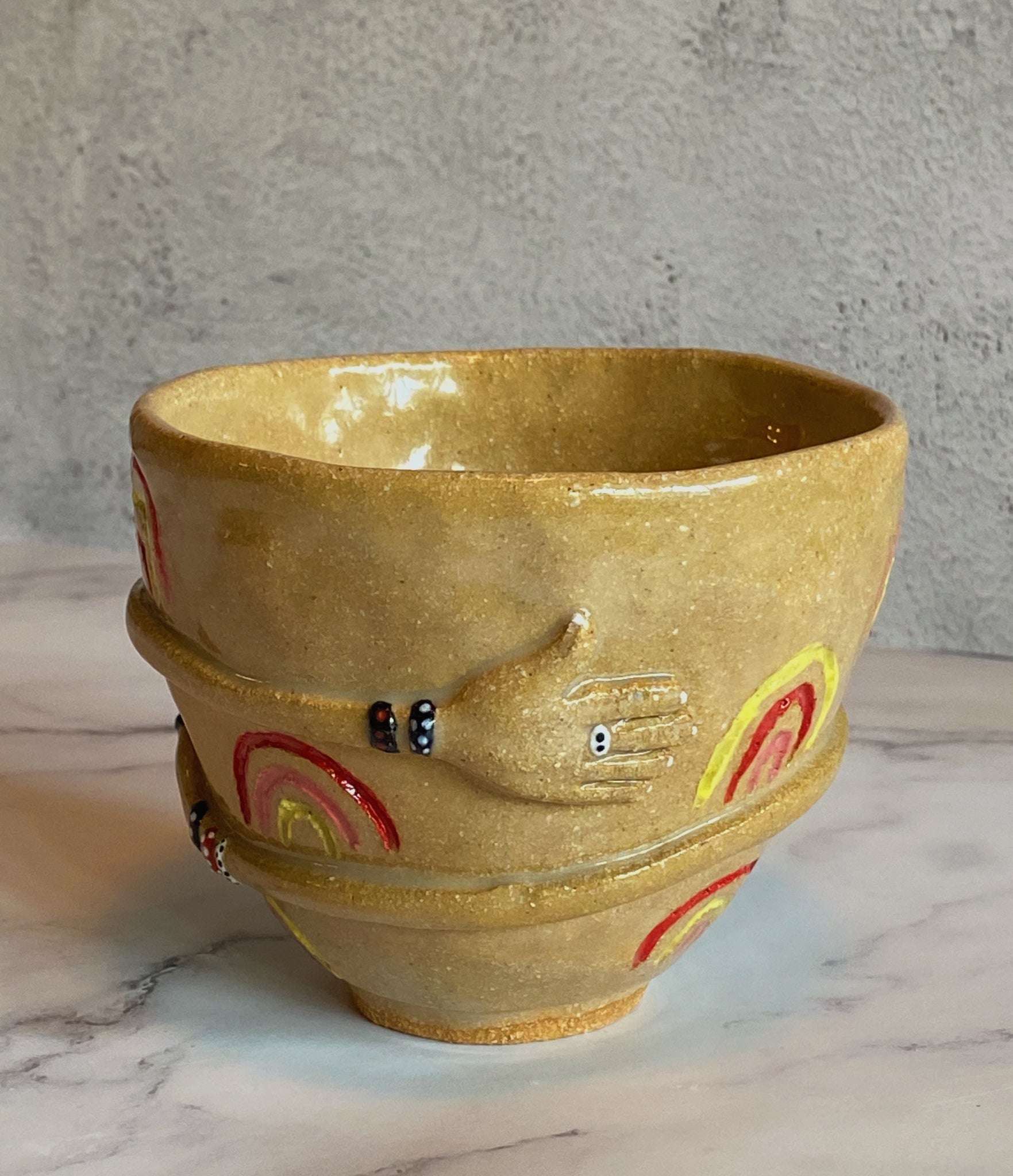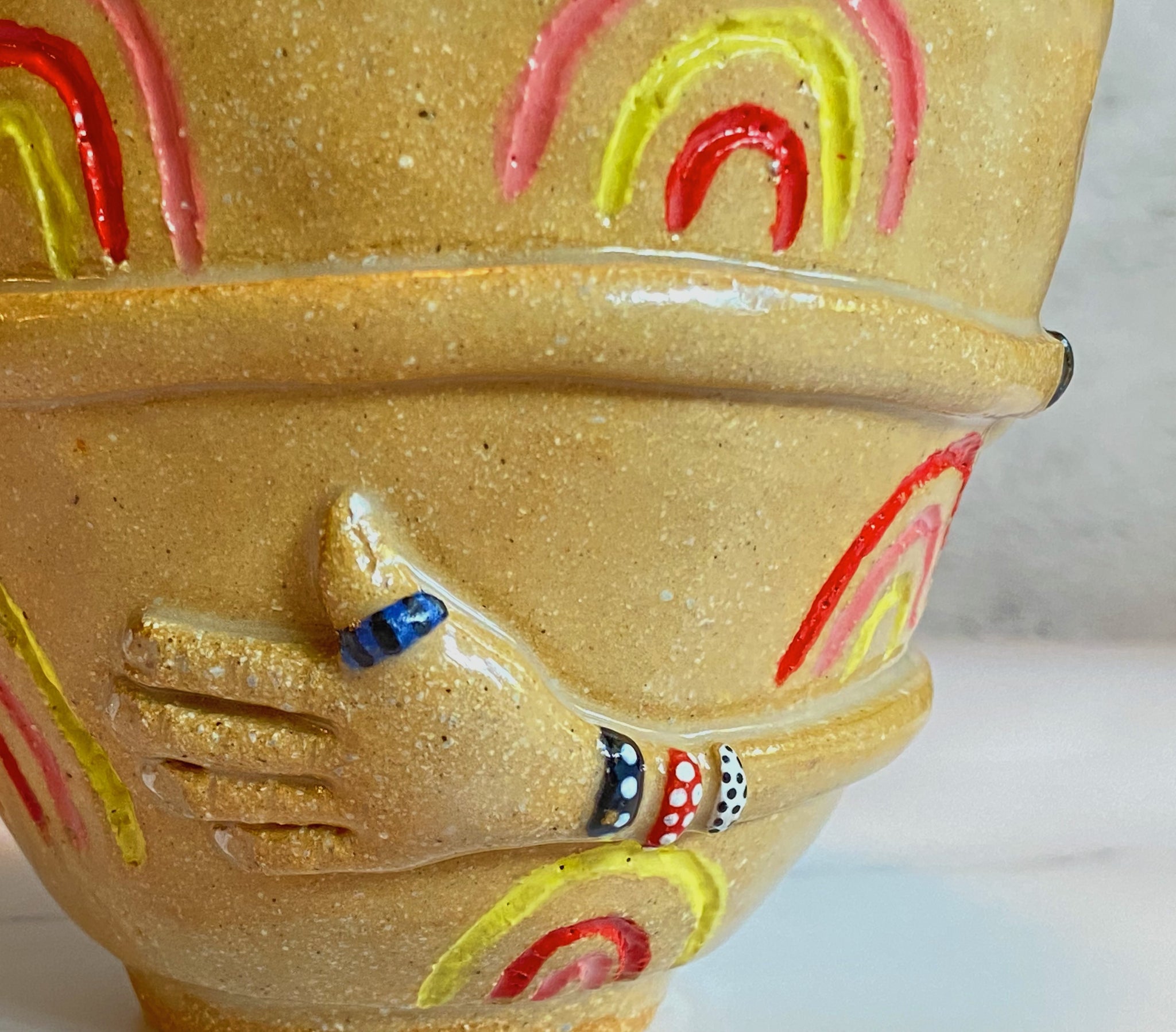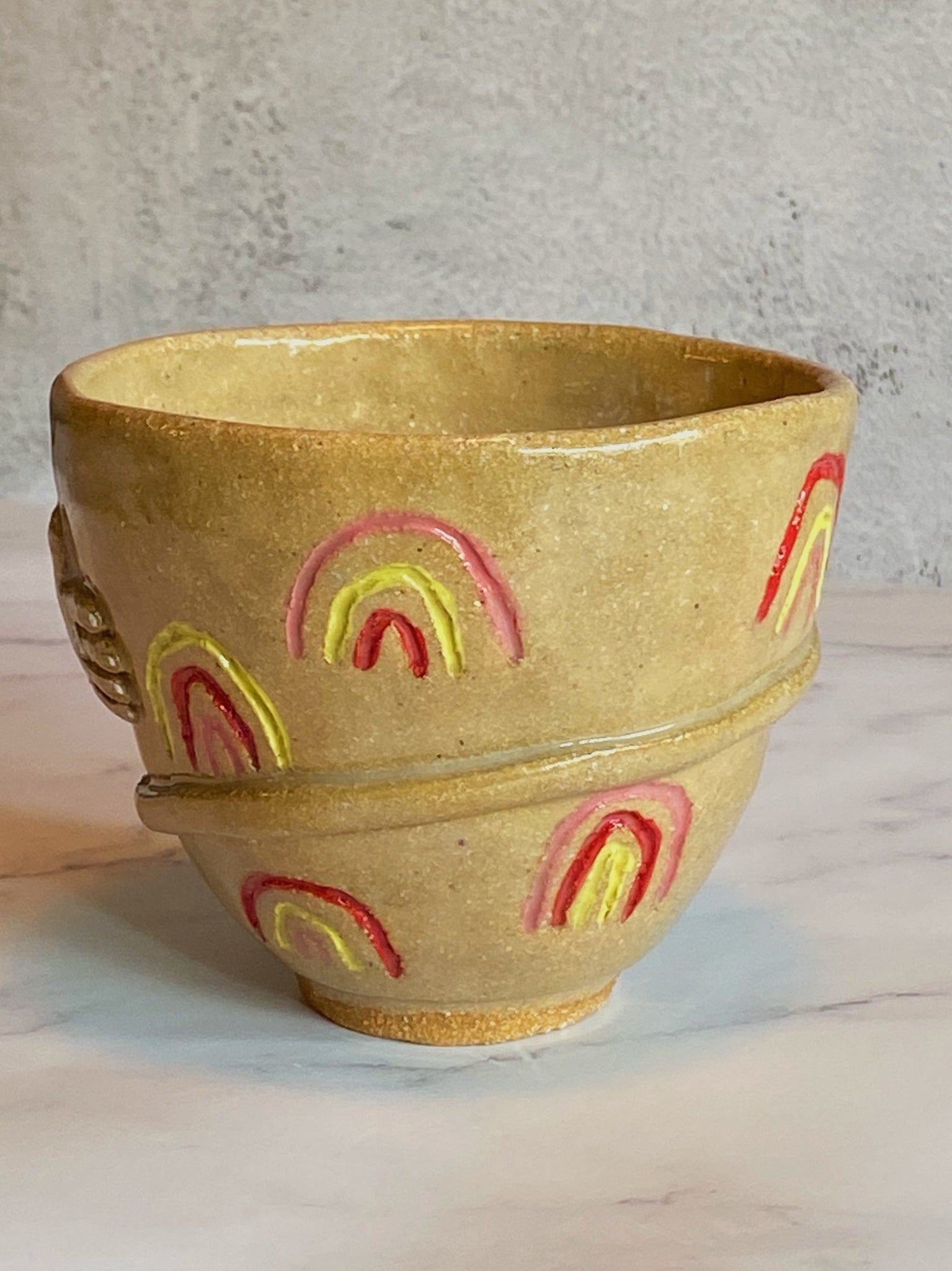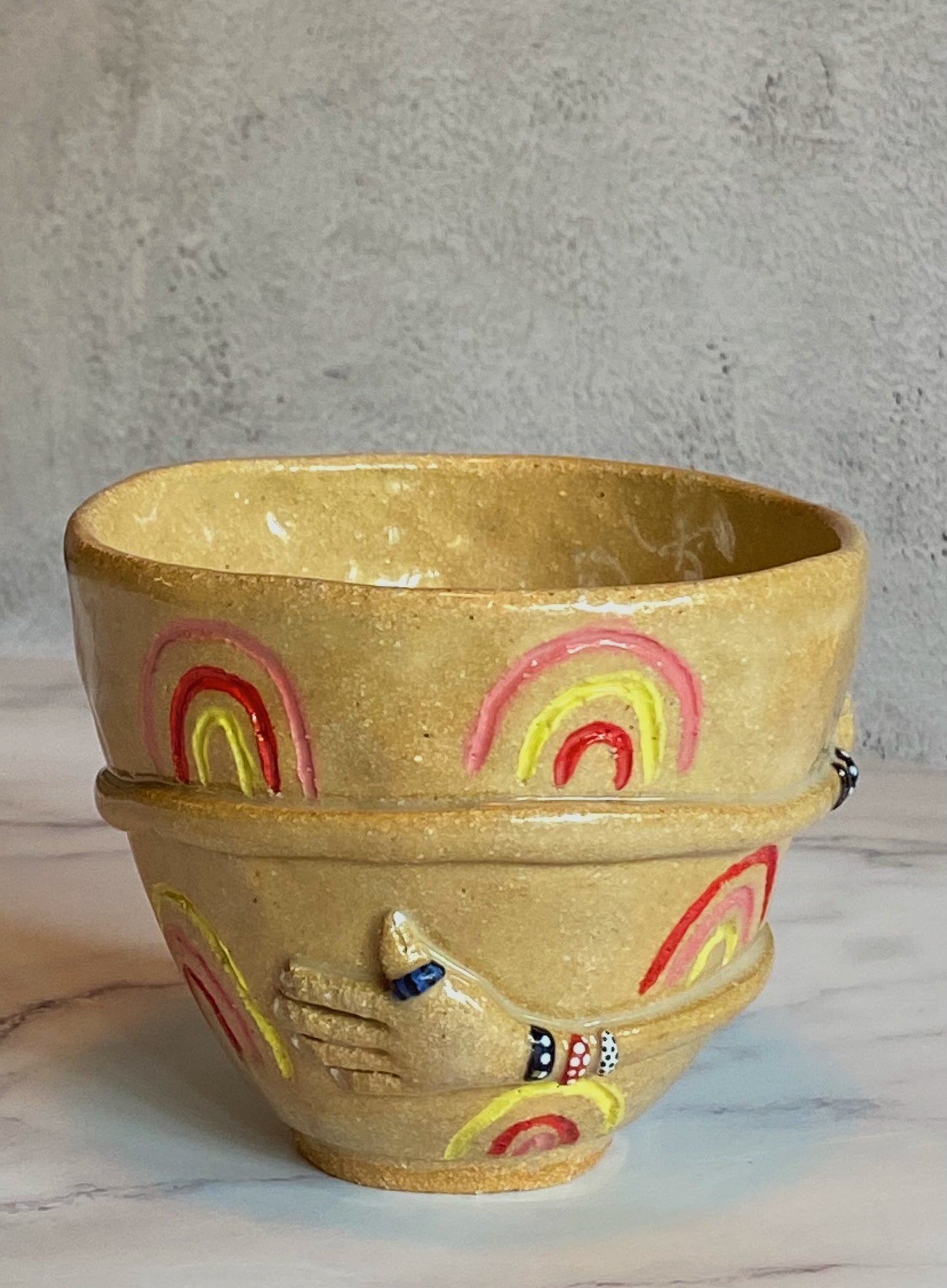 Sand Rainbow is a one-of-a-kind Hug Mug. Handbuilt from sand buff claybody. The Rainbow Hug is etched, painted, and finished with a clear glaze.
